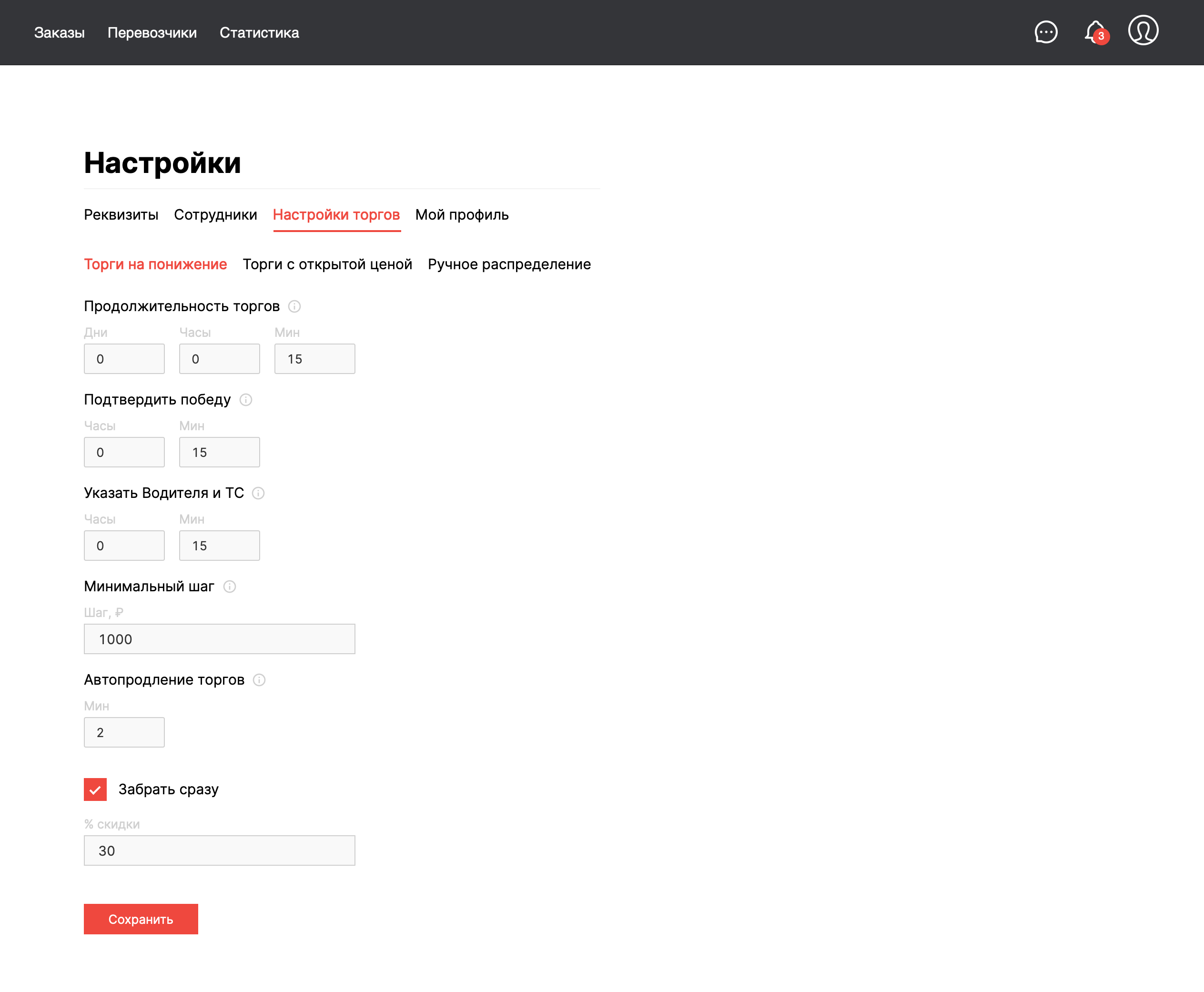 Настройте параметры торгов: минимальный шаг, продолжительность торгов, срок ожидания подтверждения от перевозчика и назначение водителя и ТС, % скидки, автообновление торгов.