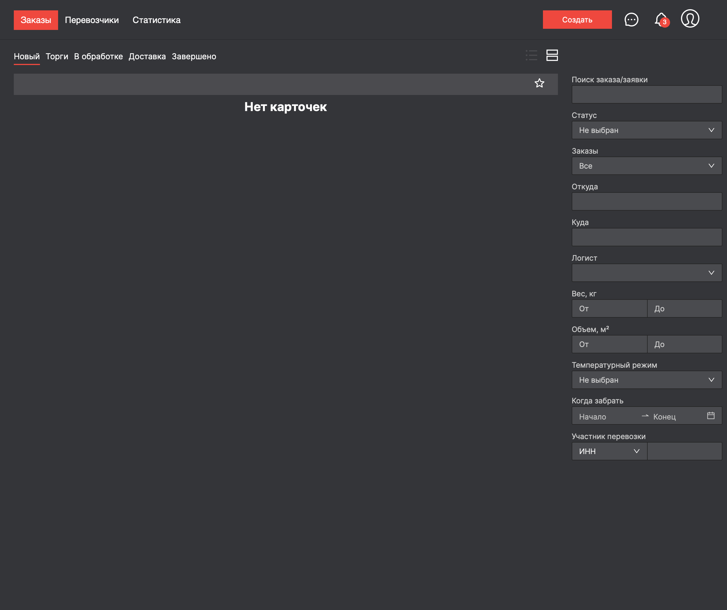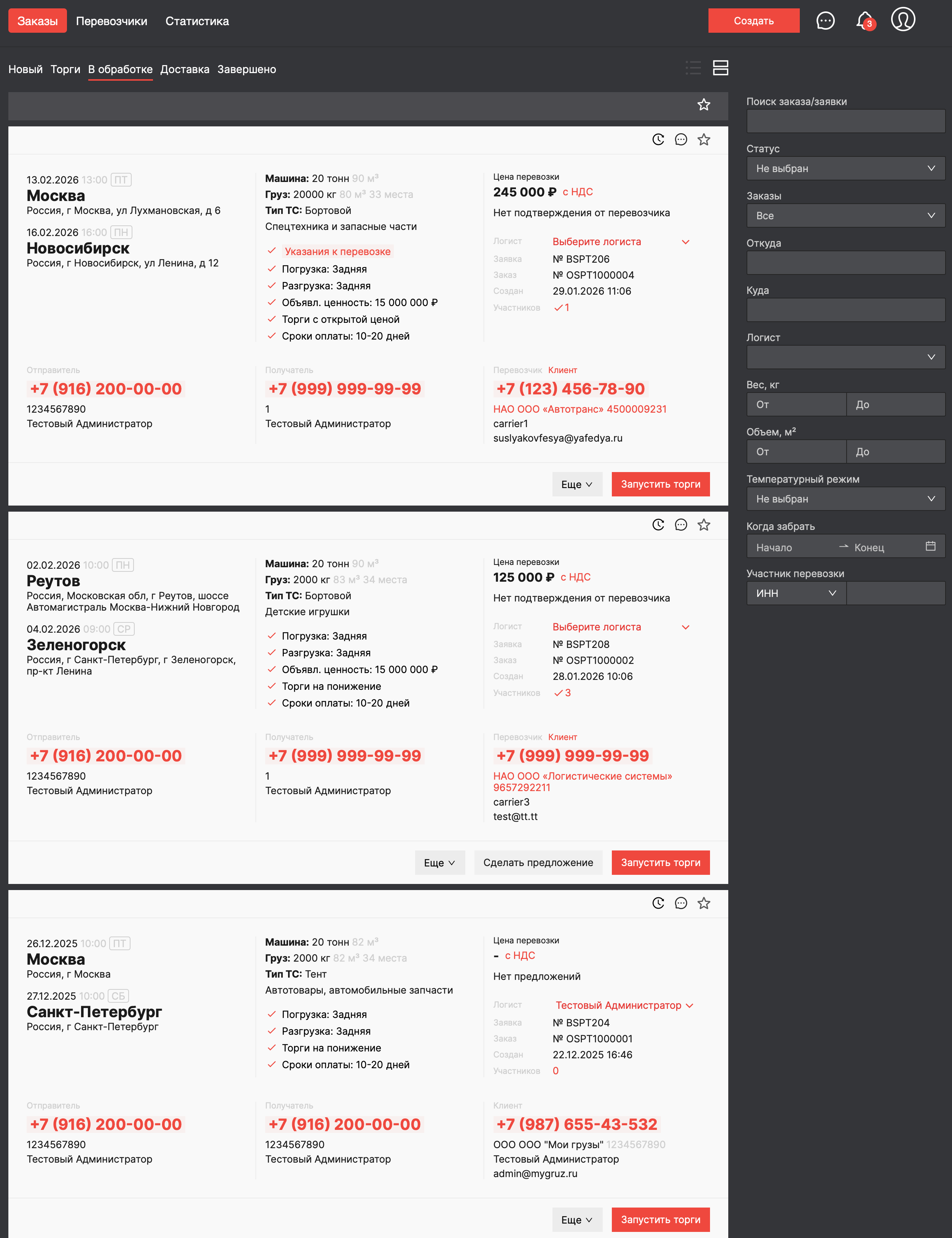 В обработке - отображают заказы, ожидающие подтверждения перевозки от перевозчика и указания данных водителя и ТС