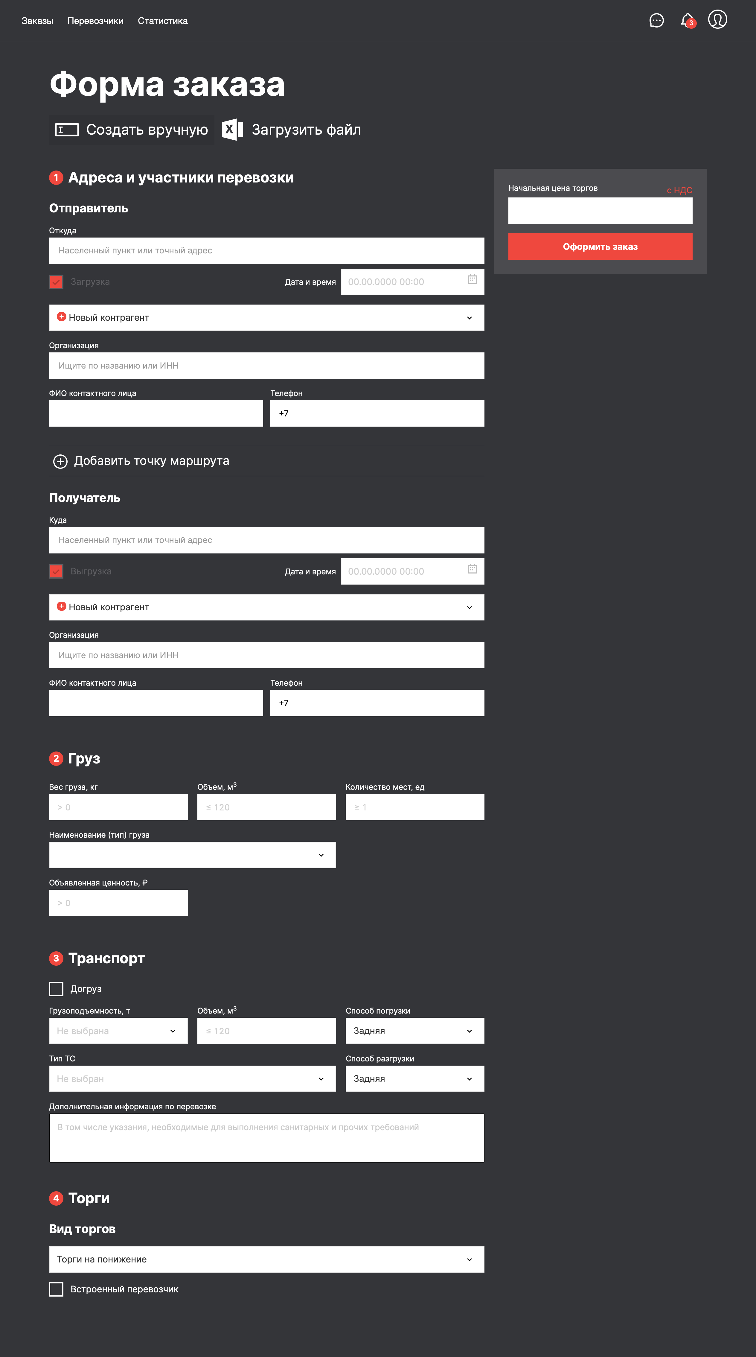 Создание заказа на перевозку