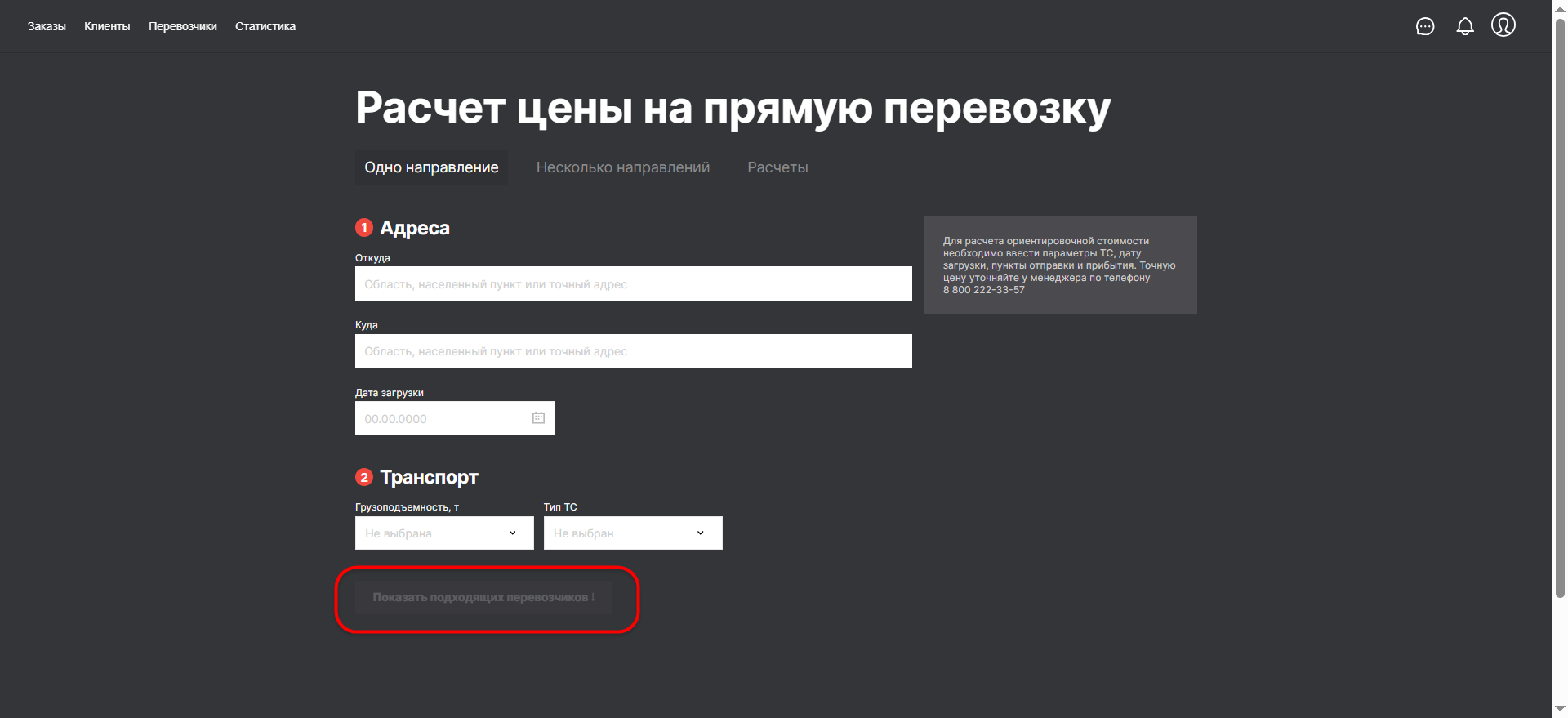 При наличии подходящих под параметры расчета перевозчиков кнопка становится активной.