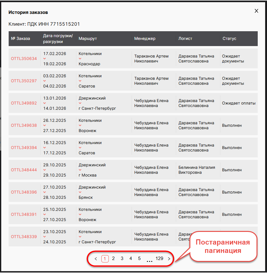 Данные по истории откроются в модальном окне. Информация представлена в табличном виде с пагинацией.